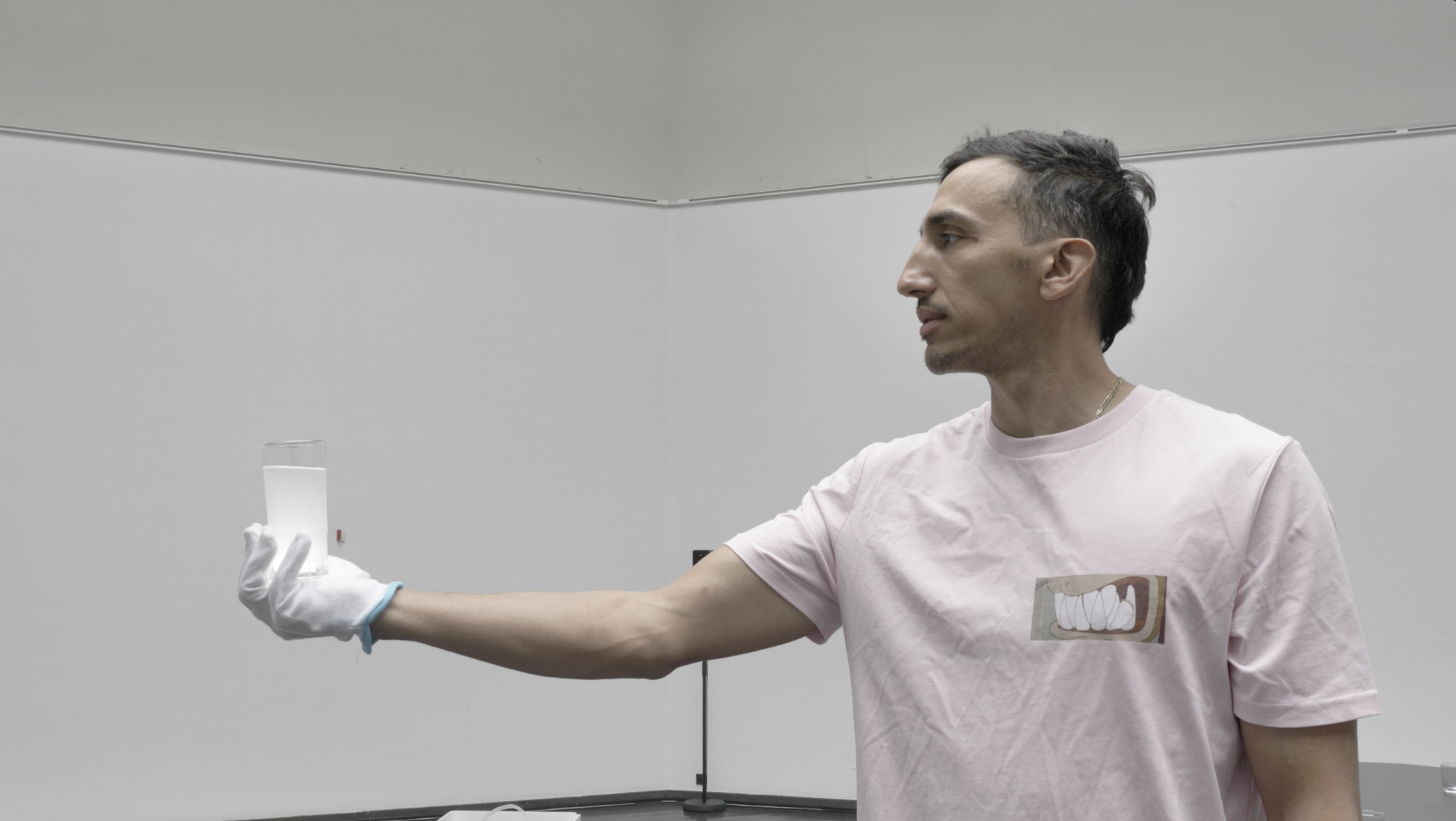 Så følger hvad man kunne kalde forretten. En af de tre performere, der agerer tjenere, alle klædt i lyserøde t-shirts, kommer ind med, hvad der ligner papir på bakkerne. Men det er ikke alle der får et stykke. Endnu en usikkerhedssprække eller et mellemrum i middagskonceptet. Jeg får fx ikke et stykke, men hende ved siden af mig deler sit og viser, at på papiret er et billede af et æble, og at man faktisk kan spise billedet.