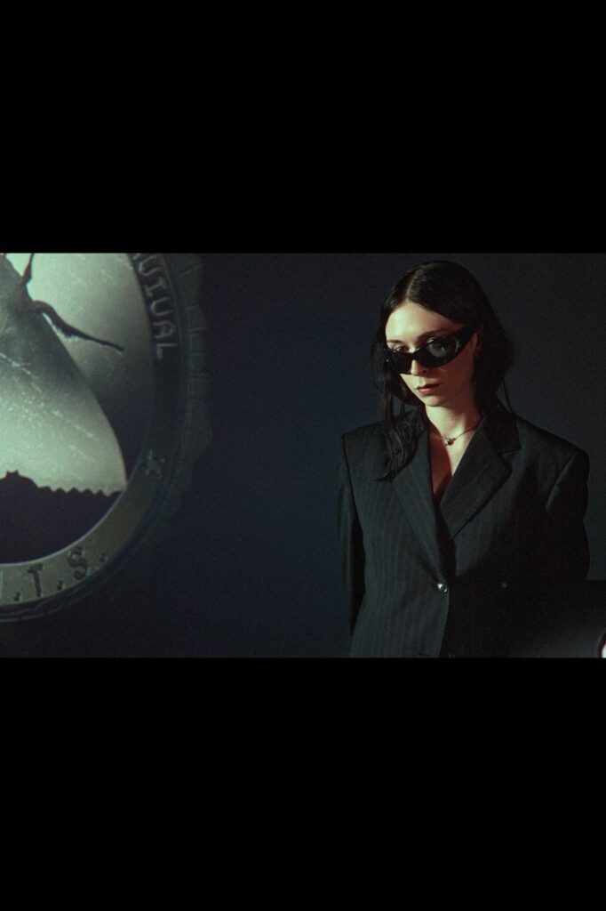 They were dressed in a grey suit, white shirt and black tie. Large black sunglasses with a fly like aesthetic covered their eyes, face painted white, hair slicked back, creating a conundrum of clashes between styles.