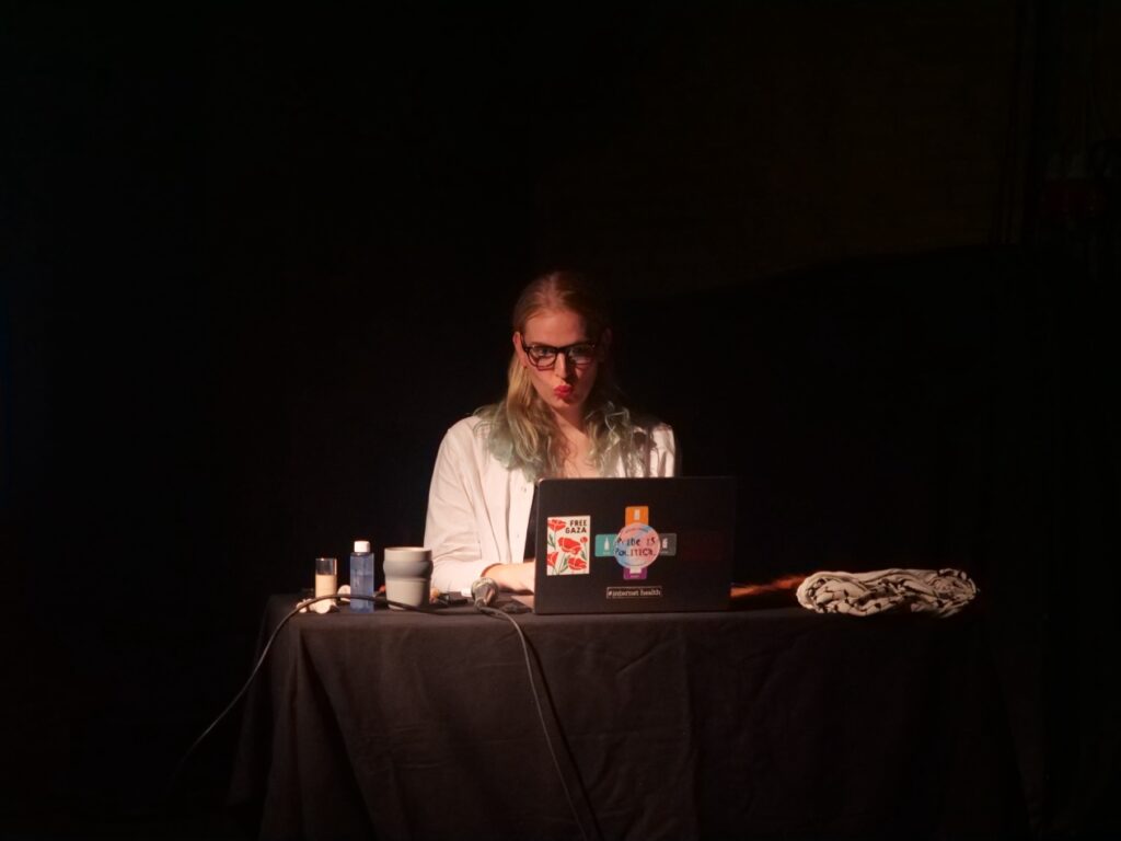 She began reading from a manuscript, based upon Shakespeare´s Hamlet, yet revised and changed as to be about a transwoman. The tragedy unfolds as the performaner speaks out an internal dialogue, questioning how to be in relation to her dead father, who left her a heritage of ideologies.