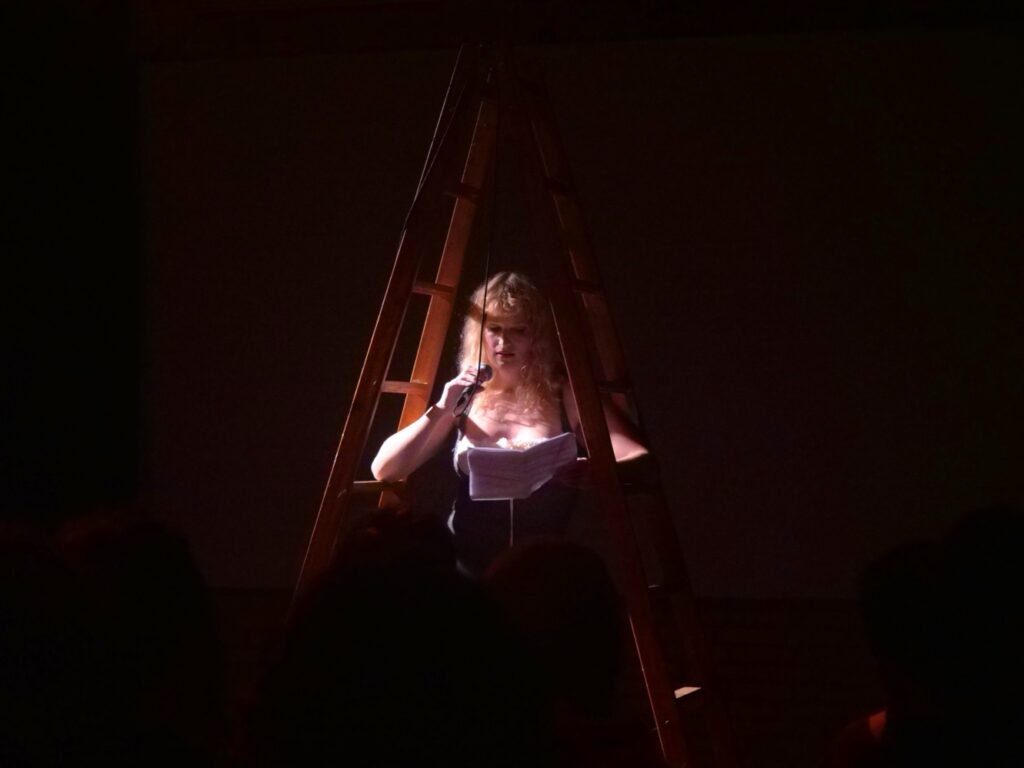 After a short break Cassie Augusta Jørgensen performed her piece Natures Freak. She entered the stage wearing lingerie and began a choreography with a ladder, placing herself around it and under it, perhaps as a nod to the idea of both climbing a ladder as to reach somewhere new as well as the old superstition, where you are cursed if you pass under a ladder.