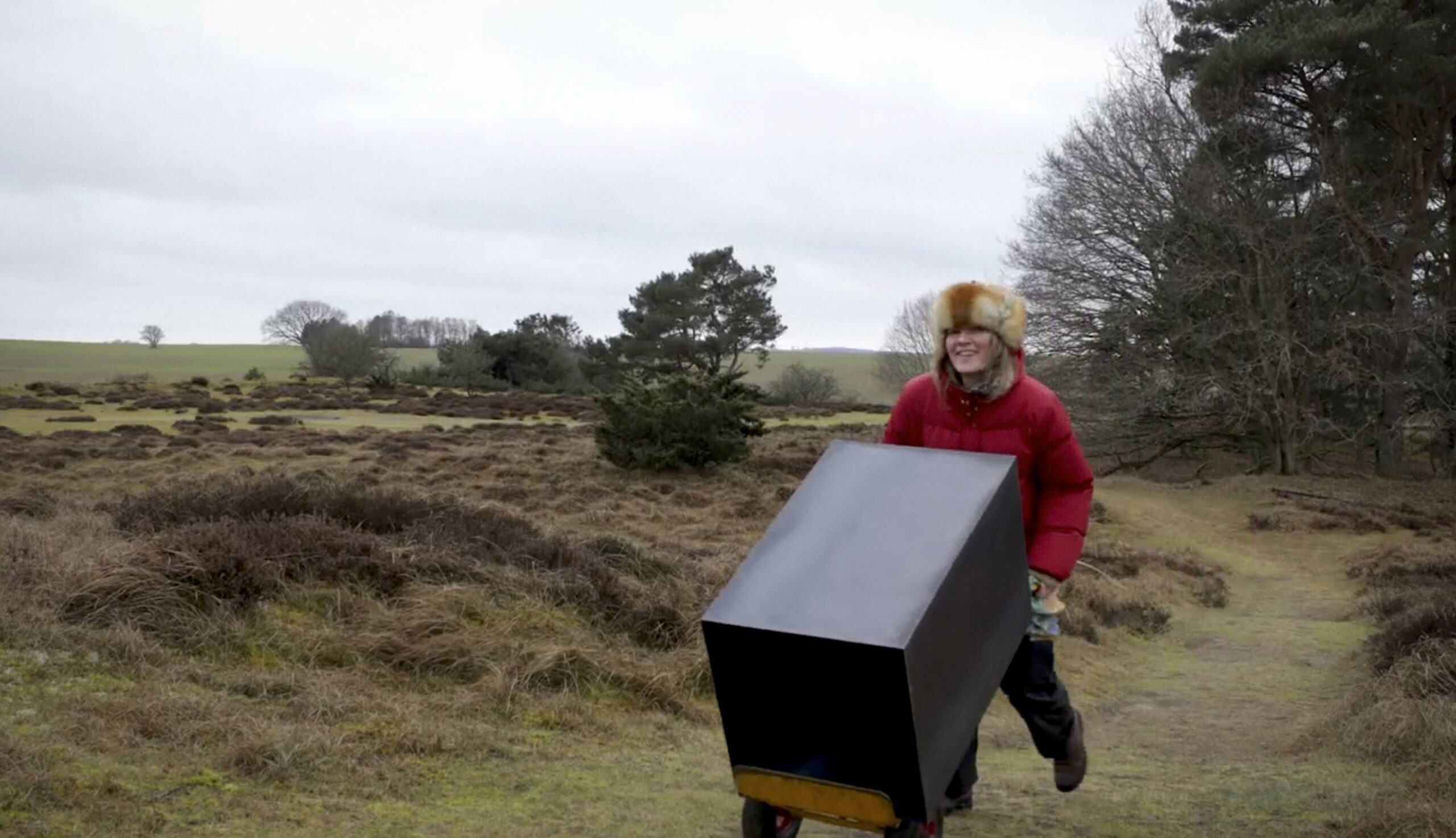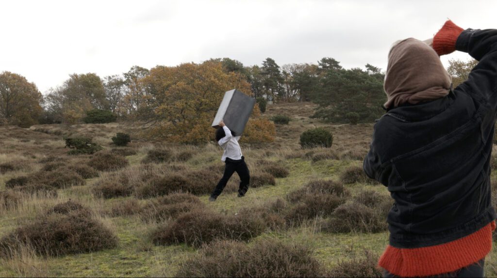 Frida Gregersen med soklen i Rudolf Tegners Statuepark. Foto: Still fra video af Frida Gregersen