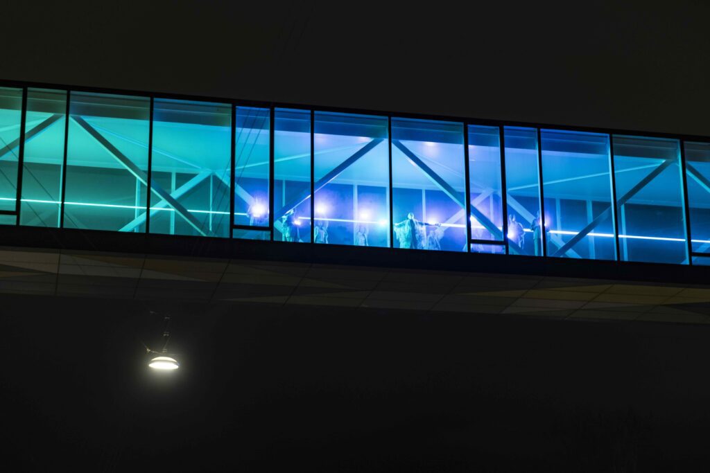 Har I lagt mærke til glasbroen over Jagtvej? Jeg havde ikke rigtig, men under Copenhagen Light Festival blev jeg opmærksom på det gennemsigtige, rektangulære rum svævende over byen. For pludselig dansede en lyskilde gennem glasbroen.  Og flere lysstråler fulgte med, så en duet og flere formationer opstod. Farverne var blå-grønne og blev også ledsaget af røg, og min veninde, som jeg var sammen med ude at se forestillingen GRID af Astrid Sten Andersen, fortalte mig, da forestillingen var slut, at hun havde fået associationer til havet og dybhavsfisk. Lidt efter dukker nemlig også først en danser op, Astrid Sten Andersen (en ny stemme i dansk performancekunst) klædt i blå-grønne luftige og svævende gevandter, eller måske er det lyset, der smitter af på hendes tøj. Universet i gangbroen over Jagtvej kan i hvert fald kalde på underhavsbilleder, hvor højst specielle arter har udviklet sig gennem årtusinder, fx fisk, der har lys på.