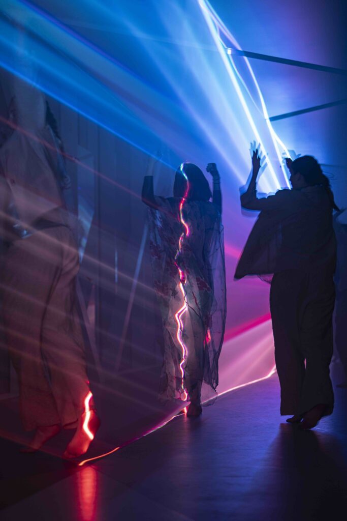 Under Copenhagen Light Festival blev glasgangbroen over Jagtvej åbner med en glitrende laser-lysinstallation og syv dansere.
