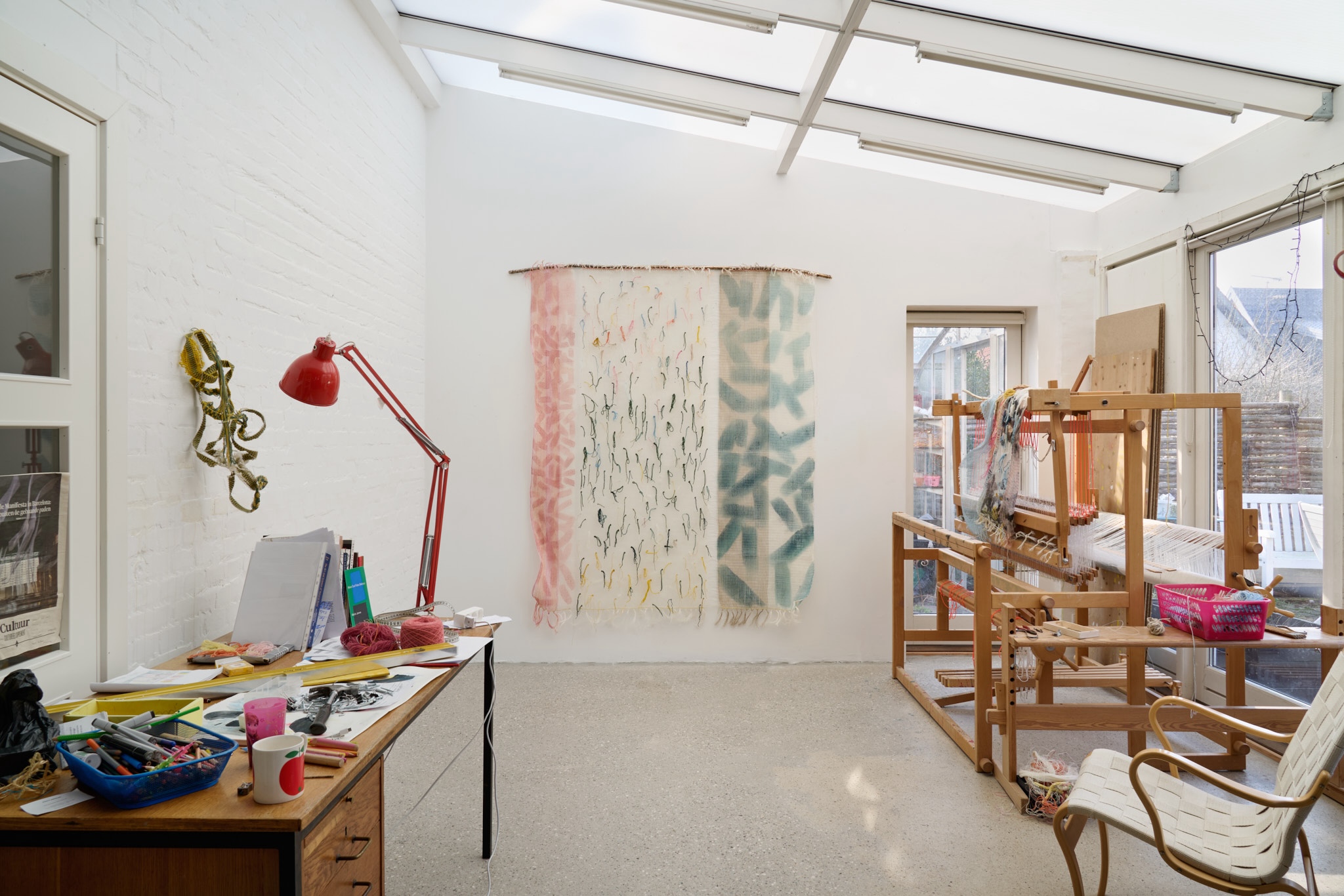 “Jeg var alligevel overrasket over, at det ikke kunne være på væggen”, siger Maria, mens hun for et kort øjeblik bekymrer sig om, hvad hun skal gøre med de tre resterende værker, når de engang skal tages af væven for at komme op at hænge. Atelierets anden frie væg er nemlig noget mere utaknemmelig, fordi loftet hælder ud mod terrassedøren og atelierets tilstødende have. “Det finder jeg en løsning på til den tid”, siger hun skråsikkert, og jeg stoler på hende.