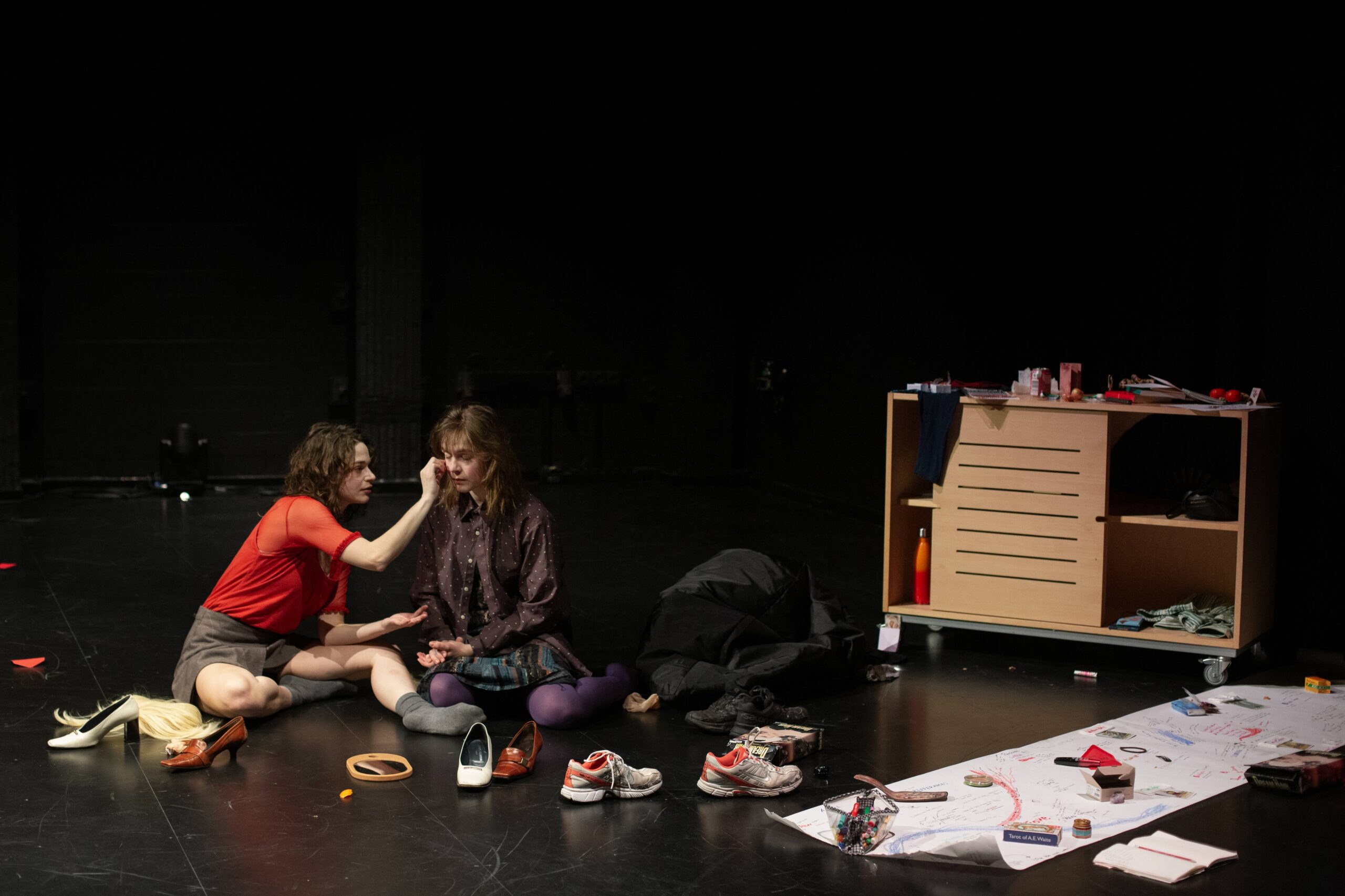 In the black box you had made a small altar in the corner. It consisted of a wooden cabinet with drawings, notes, books, snacks, wigs, shoes, tarot cards, a mirror and a fan among other things. Was it an altar for crying? Or was it tools to help you not to cry?