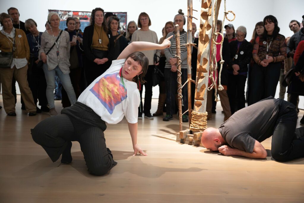 Maybe Solbakken’s “giving away the keys” is one part of this, but there is so much more work to be done. This is also evident in the commissioned performance walk Uskkádat Ustaria by Elina Waage Mikalsen og Jassem el Hindi exploring what autonomy can look like inside the colonial space of the museum. “The artworks on the wall seem to always have been here. No hands were involved. The museum popped up with the art already there,” the two artists recite from their script.  “Who wrote the wall texts? No one knows,” they ask cheekily, acting as fellow archaeologists to Dagny Juell’s The Guided Tour. Mikalsen and El Hindi look for stories in the dust on the artworks. They look for what stories are included and excluded in the museum. And they look for their own stories: Mikalsen is of Sámi descent and El Hindi of Lebanese and Palestinian descent. “Where is my language?” Mikalsen asks, as the two look for kin in the collection. El Hindi recites from Lebanese artist and poet Etel Adnan’s beautiful book The Arab Apocalypse from 1989 and the two of them do a tender dance around the sculpture Vealahančuoldda  / Diskrimineringens påle  (The Pillar of discrimination) from 1987-1993 by Sámi artist Iver Jåks. At some point they serve lingonberries for the audience, that they have brought in a basket. Mikalsen and El Hindi tell us how food is not allowed in the collection, and that it was a long negotiation with the museum, because the berries could colour the floor. “No berries!” they yell tauntingly, before they each serve us a single sour berry.