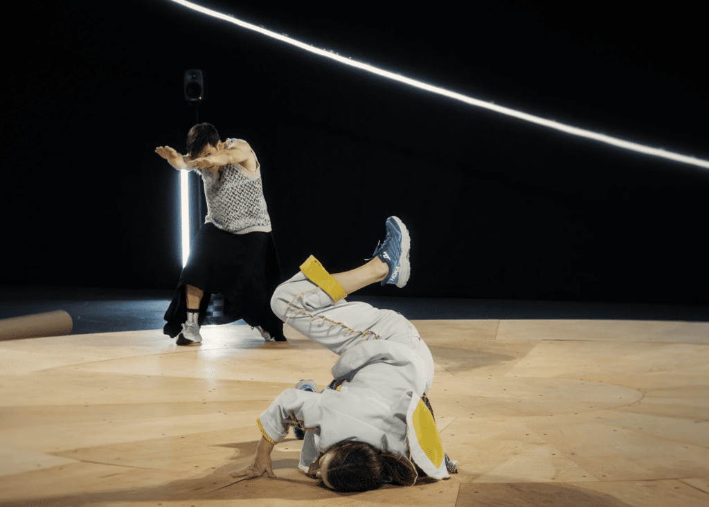 Performerne starter en mere dynamisk bevægelsessekvens. Som et pendul bevæger de sig frem og tilbage, bevægelserne udvikler fra at være små til at blive større, til at blive bevægelser, der forbinder performerne til hinanden. De får øjenkontakt, der er forbundethed og opløsning og forbundethed igen. De finder samme rytme, indtil rytmen brydes, indtil taktfaste lyde af deres sneakers finder rytmen igen.