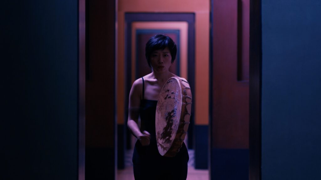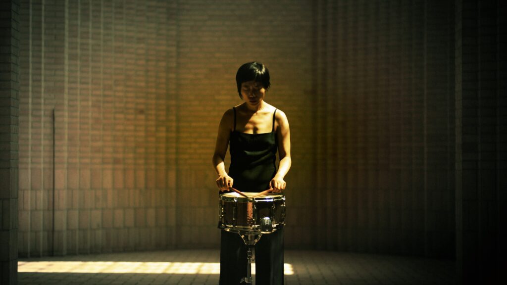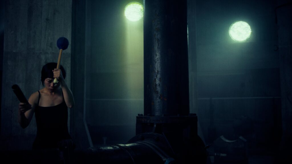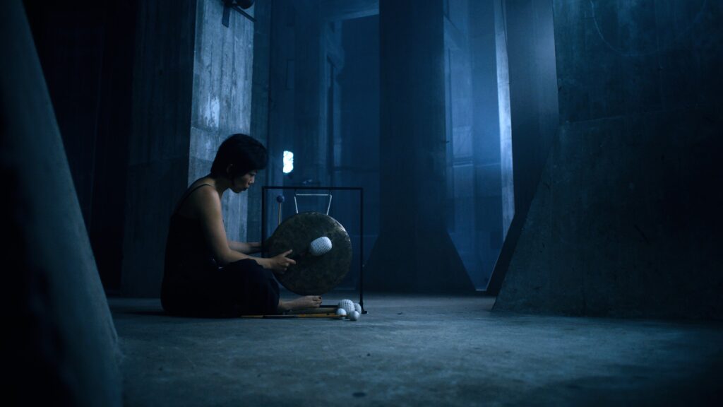 Det audiovisuelle, arkitekturen og musikken går op i en højere enhed gennem Ying-Hsuehs performance – en krop, som bliver ved med både at slå og lytte.