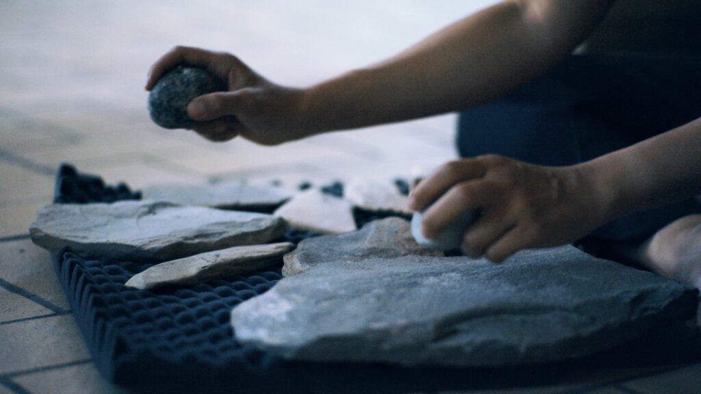 Du sidder næsten i en hule i kirken, et lille indhak i muren, og slår små flade kalksten mod en større stenplade. Helt let, som havde stenen sin egen drøm, som om lyden varer for evigt, båret videre i marimbaens toner. Du slår med fire køller og rammer fire toner ad gangen – dybere, så lyst i de tomme rum. Melodien består af fire toner og overtoner.